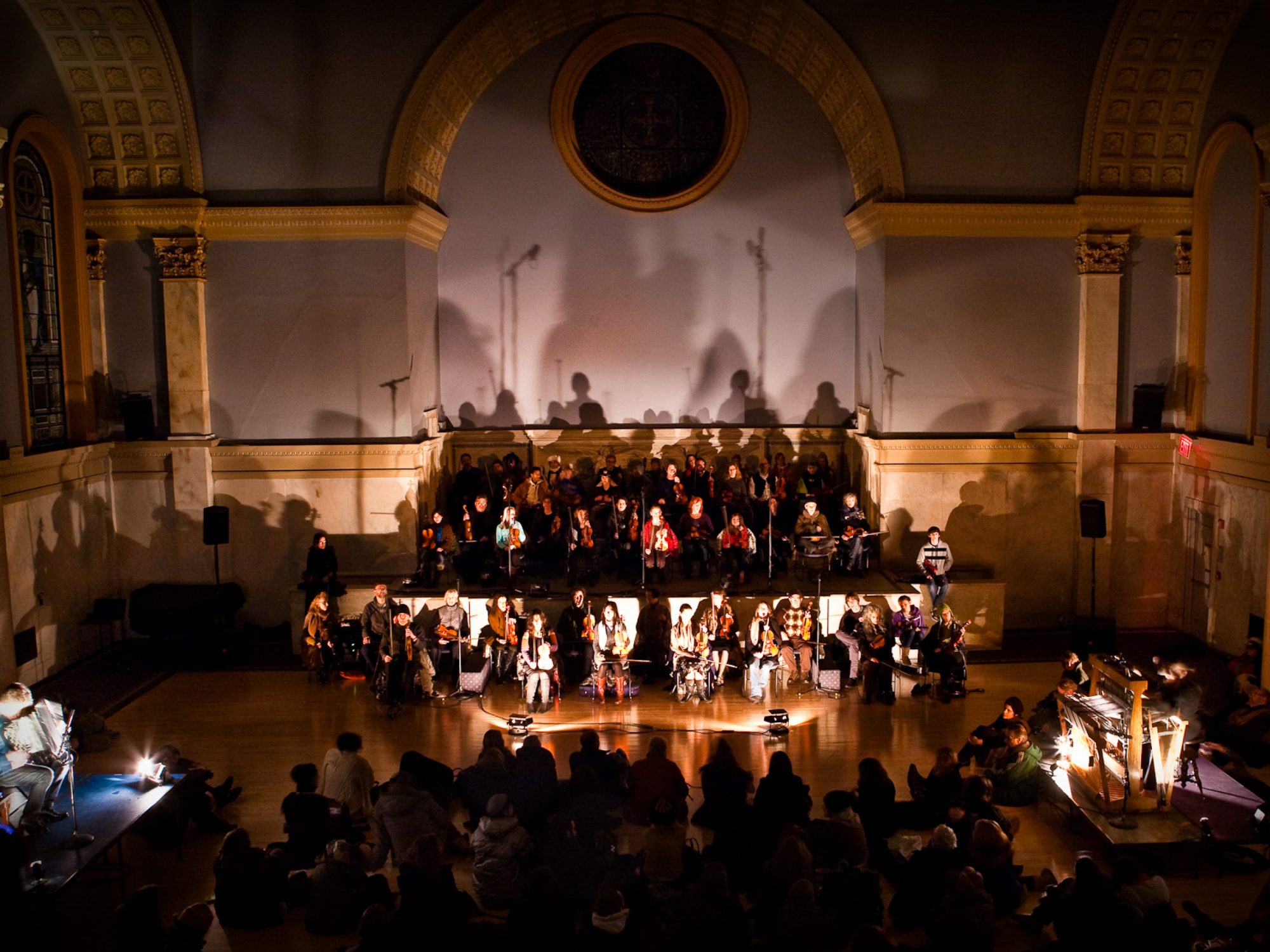 Rerememberer is scored for amplified weaver, accordionist, DJ, sound design, lighting, underscore, conductor and an orchestra of fifty violinists who have never played violin before. The use of amateurs refers to the folk tradition of the weaving, returning the homespun quality of the fabric to its origins. It premiered at Judson Memorial Church in New York City on January 17, 2009.